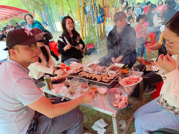 11:30體育運(yùn)動結(jié)束后,大家來到燒烤場進(jìn)行自助燒烤。燒烤場座落在綠蔭濃濃的竹林中,雖是冬日,卻煦日暖暖,溫和的陽光打在竹葉上,落下斑駁的日影,清風(fēng)襲來,沁人心肺。燒烤場里飄香四溢的烤全羊、外酥里嫩的烤香豬、肥肥的雞腿、嫩嫩的雞翅、勁頭十足的牛肉丸,還有火腿、茄子、玉米、青椒等早已備好,此時大家早已饑腸轆轆,便迫不急待地動起手來,“自力更生”,喂飽自己的肚子! 大家團(tuán)坐在烤爐旁,你遞個調(diào)料,我刷下辣醬,互幫互助,默契盡在不言中,其實(shí),這也是一種心靈的溝通與交流。